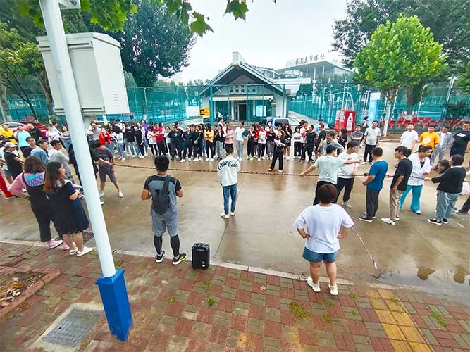 大家一排站好,從左到右,每人的右腿與另一人的左腿依次并齊,并用扁帶繩子系上,繩子綁的位置是腳踝以上部分。聽見哨聲即為游戲開始,從起點到終點,按用時由短到長,取前五名依次加分。